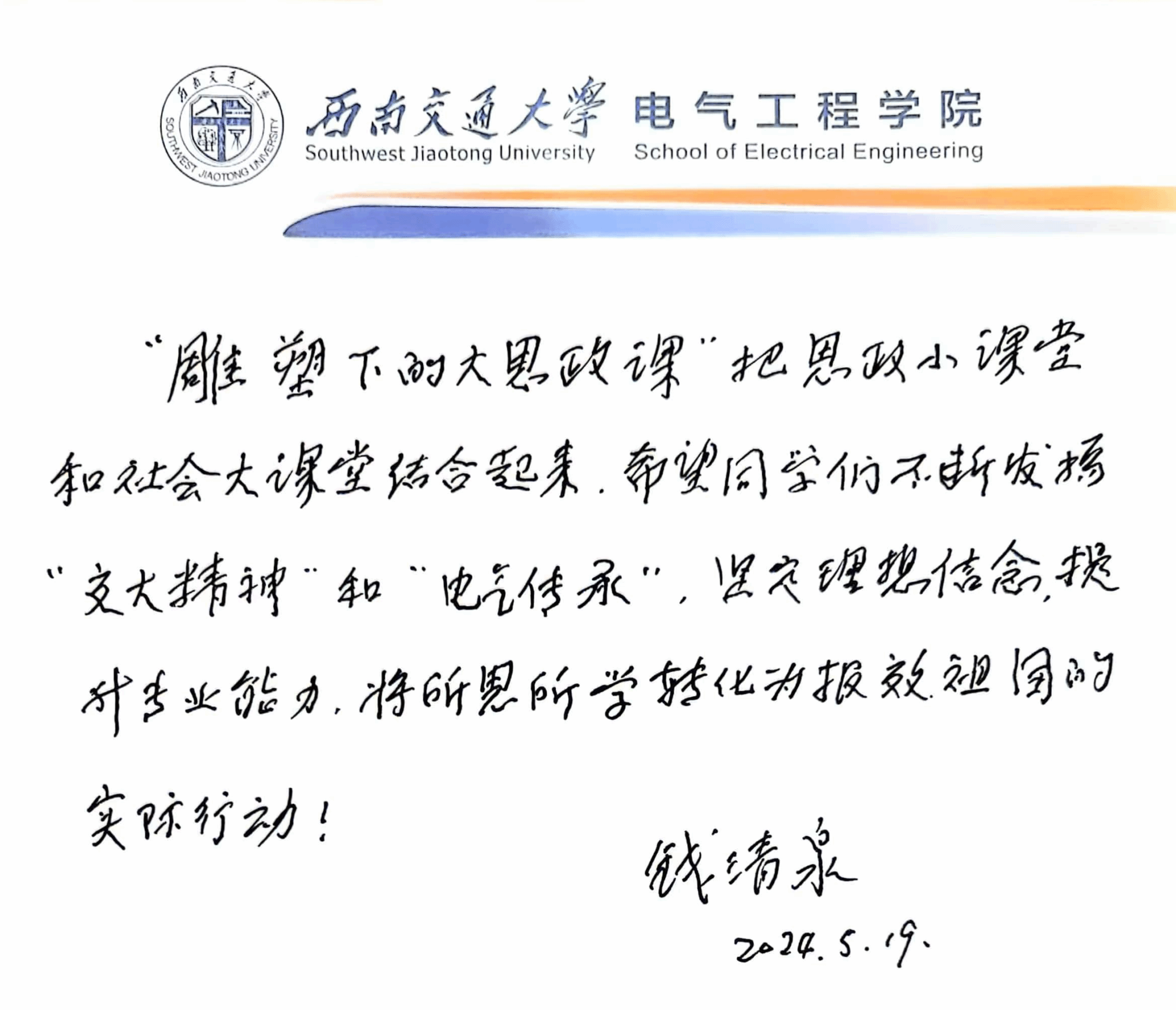 88岁高龄的钱清泉院士依然十分关心学院发展,点赞“雕塑下的大思政课”,肯定了学院长期以来坚持做好思想政治教育工作,形成了师长“善教”、学生“乐学”的良好风尚,寄语电气学子:“‘雕塑下的大思政课’把思政小课堂和社会大课堂结合起来,希望同学们不断发扬‘交大精神’和‘电气传承’,坚定理想信念,提升专业能力,将所思所学转化为报效祖国的实际行动!”