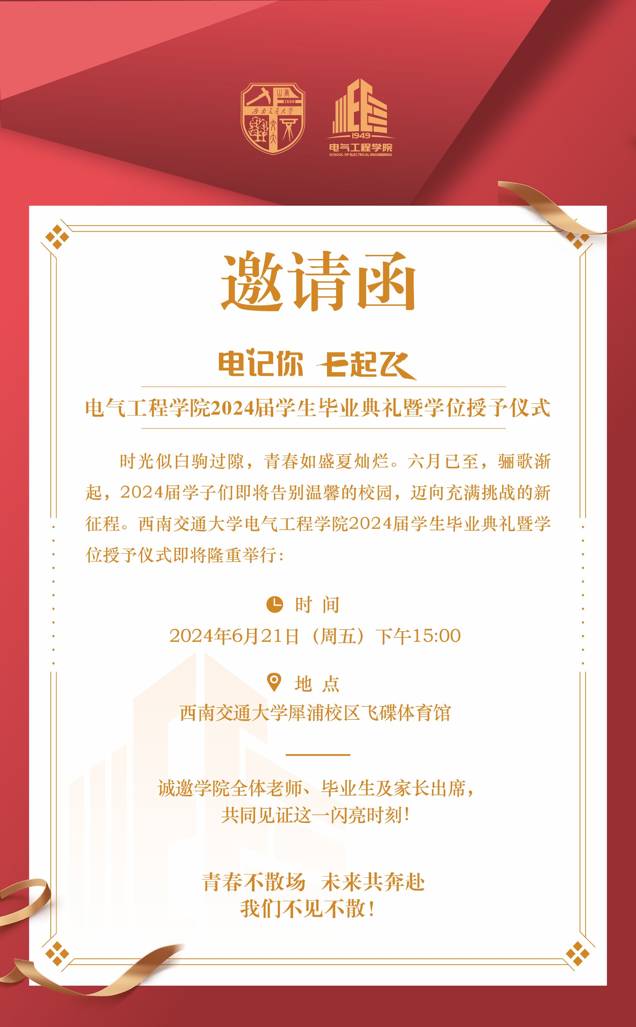 2024年6月21日(周五)15:00,老王论坛 2024届学生毕业典礼暨学位授予仪式将于犀浦校区飞碟体育馆隆重举行。在此,学院诚邀全体老师、毕业生及家长共同出席此次典礼。