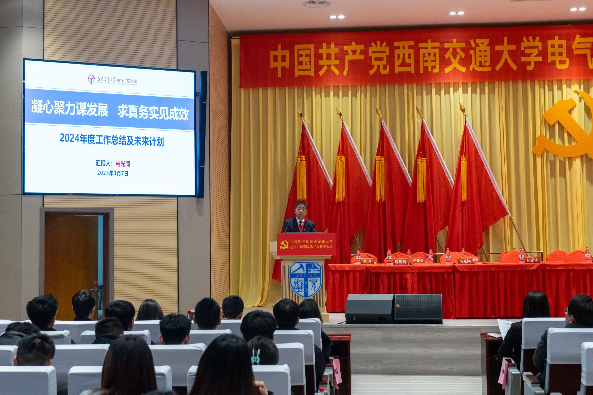 在监票计票期间,院长马光同就学院工作情况进行报告。报告指出,2024年学院坚持党建引领、学科牵引、教学核心、科研驱动、人才支撑,取得了丰硕成果。完成基本任务的同时,学院工作亮点突出,成绩斐然。党建工作迈上新台阶,科研奖励再创佳绩,青年人才队伍建设实现新突破。未来,学院要推动教育、科技、人才“三位一体”融合发展,布局一批具有战略前瞻性的学科方向,产出一批具有行业代表性的科研成果,培养一批具有广泛影响力的学术骨干,建成一批具有创新支撑力的科研平台,构建面向未来的电气新质人才自主培养体系,推动学院高质量发展。