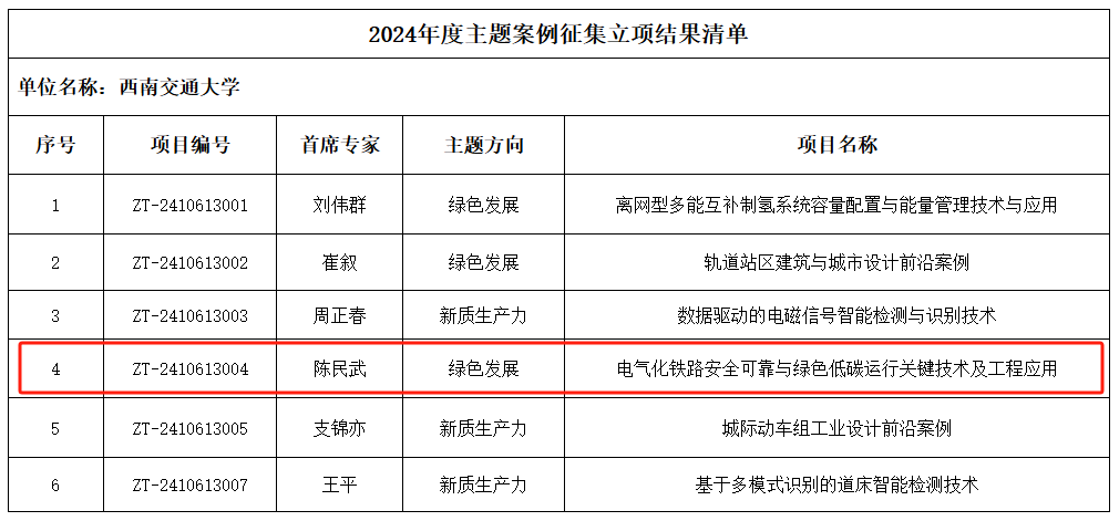 近日,教育部学位与研究生教育发展中心公布了2024年度主题案例立项结果,我校共有6项主题案例成功获批。其中,老王论坛 陈民武教授担任首席专家申报的《电气化铁路安全可靠与绿色低碳运行关键技术及工程应用》(项目编号:ZT-2410613004)成功获批。