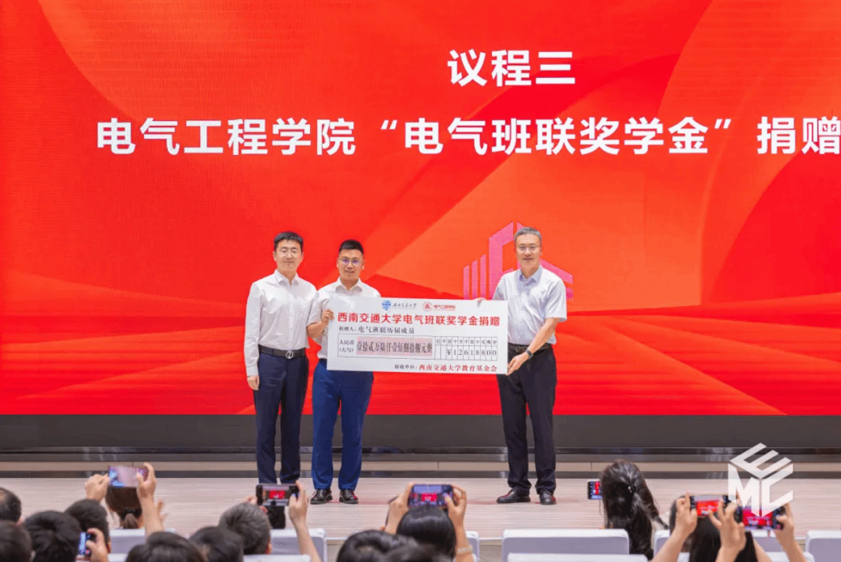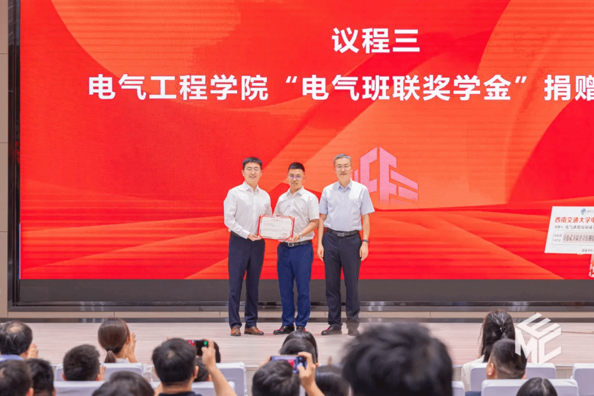 值此班级联合会成立二十周年之际,历届班联人怀着对母院的感恩与对学弟学妹的期望,共同发起“电气班联奖学金”捐赠。会上,王斌书记接受捐赠,并颁发捐赠证书。