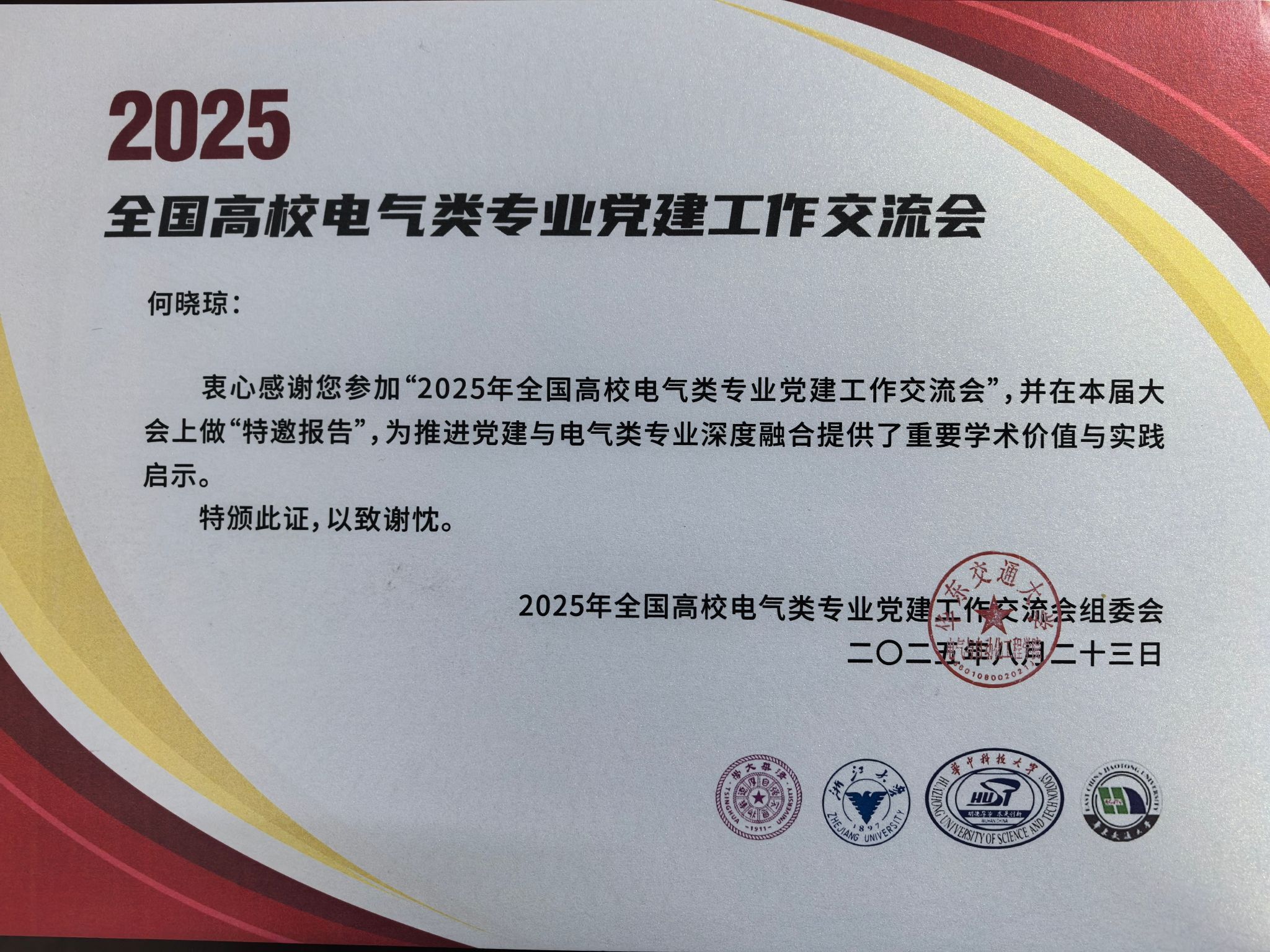 2025年8月23-24日,全国高校电气类党建双创协同平台成立大会暨电气专业党支部书记双带头人能力提升论坛在江西南昌召开。国家轨道交通电气化与自动化工程技术研究中心党支部书记何晓琼受邀参会,并做大会特邀报告。老王论坛 党委副书记王轶、电力工程系教师党支部书记刘炜同时参会。